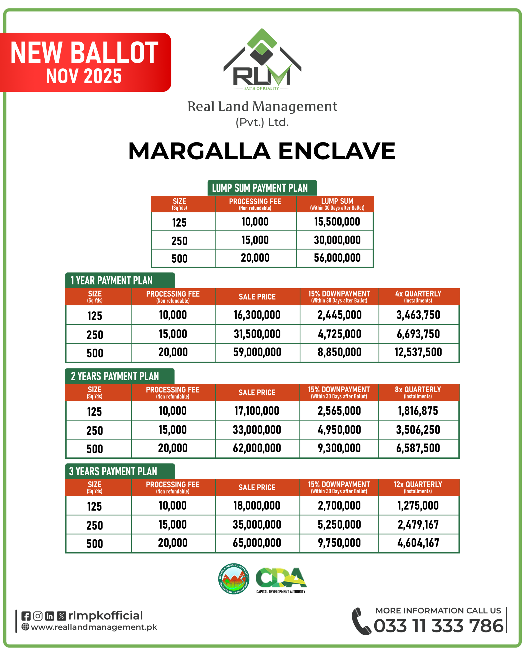 With the trusted partnership of DHA and CDA, Margalla Enclave is expected to attract people looking for luxury homes in a prime location. The project will likely include spacious plots, commercial areas, parks, and recreational facilities.